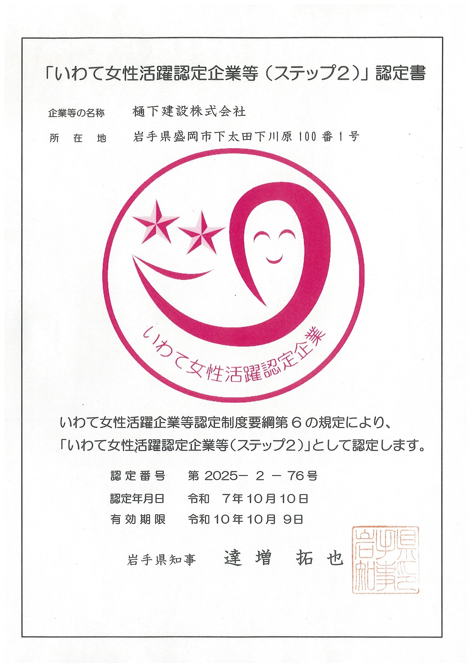 岩手県知事より『いわて女性活躍認定企業等(ステップ2)』に認定(更新)されました。 今後も女性の活躍推進に向けて積極的に取り組んでいきます。