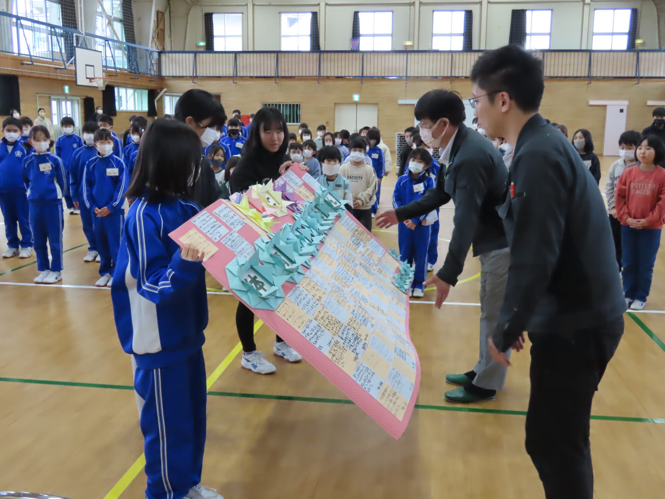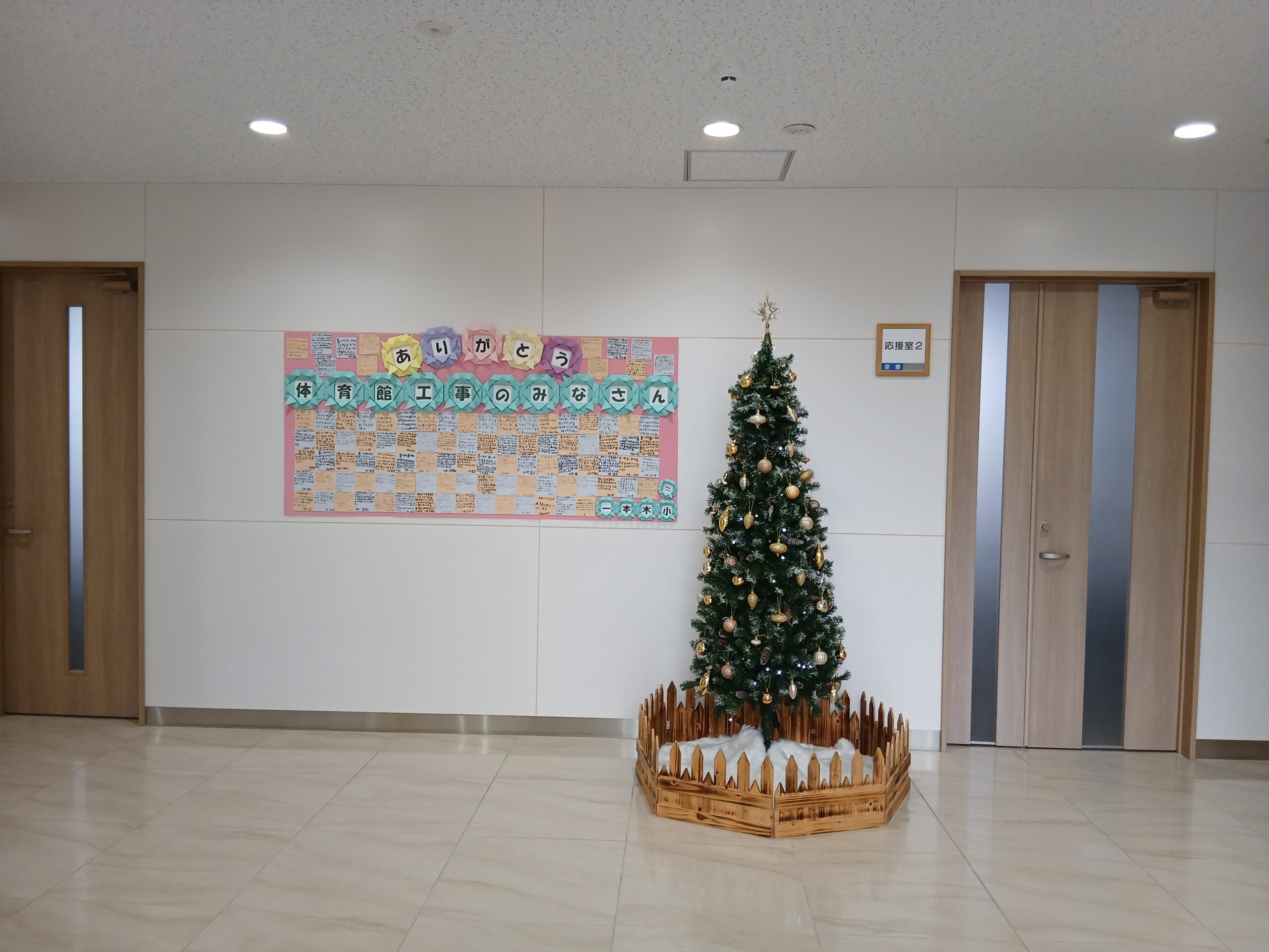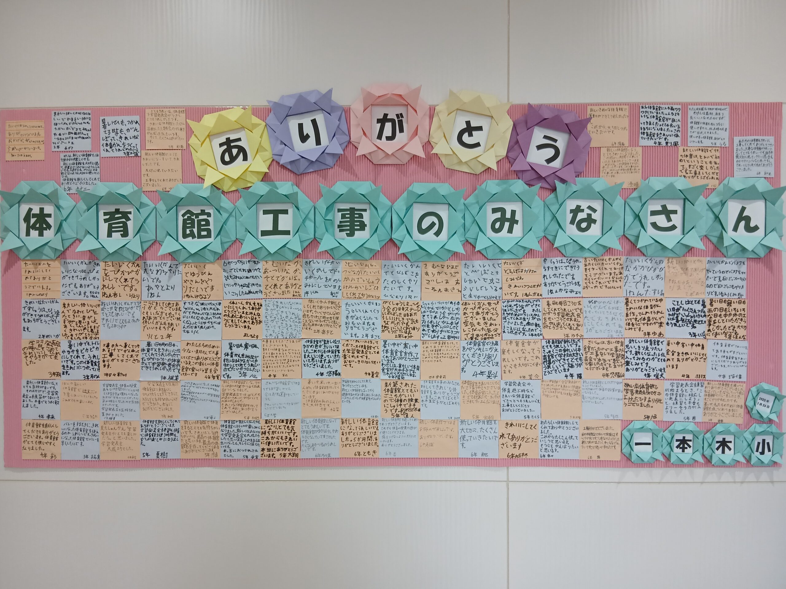当社で体育館の改修工事を行った、滝沢市立一本木小学校の児童の皆様から感謝の寄せ書きをいただきました。 新しくなった体育館を喜んでくださり、たくさんのメッセージをいただいたこと、社員一同の励みになります。 寄せ書きは本社エントランスのクリスマスツリーのお隣に飾らせていただきました。