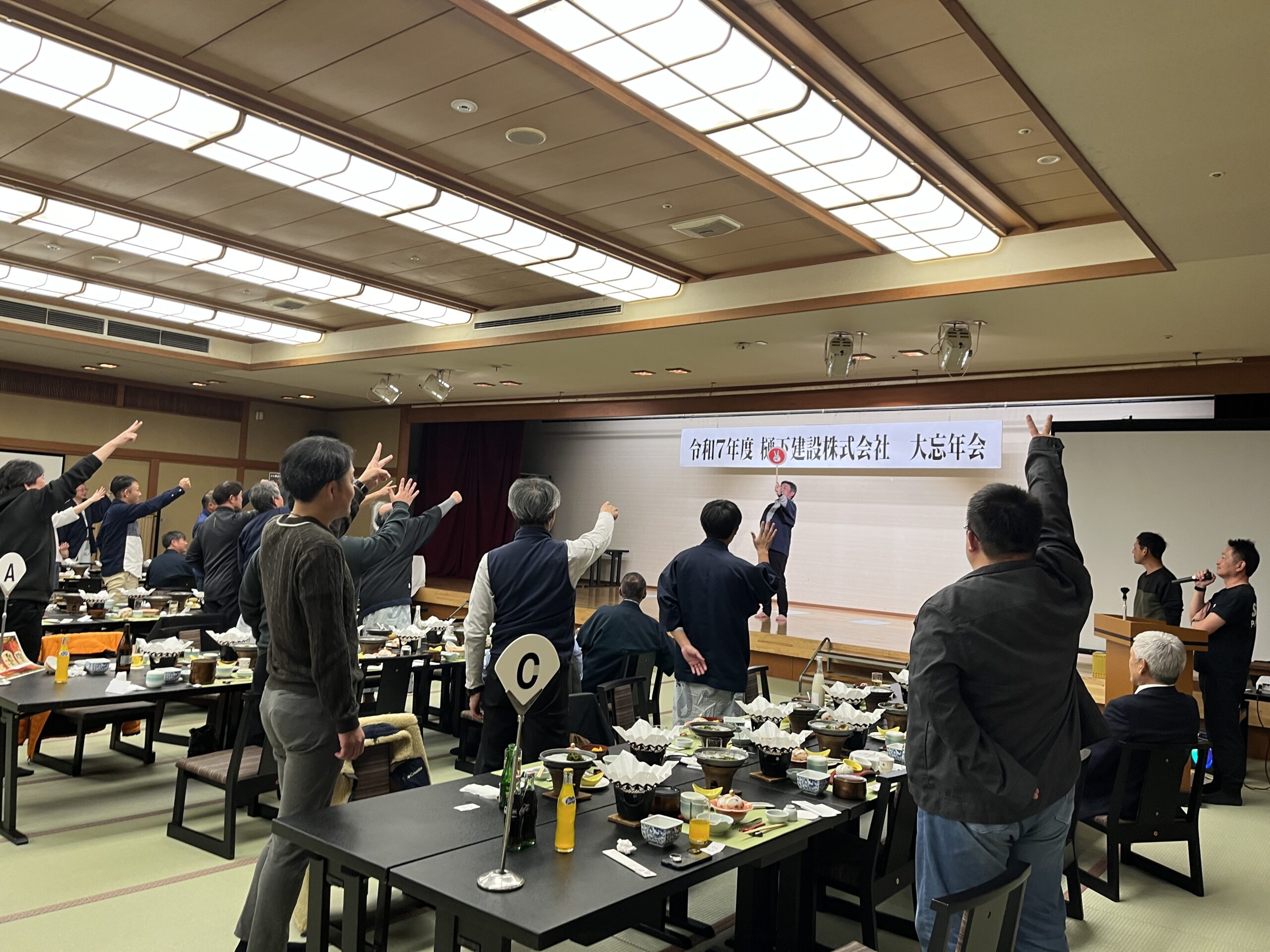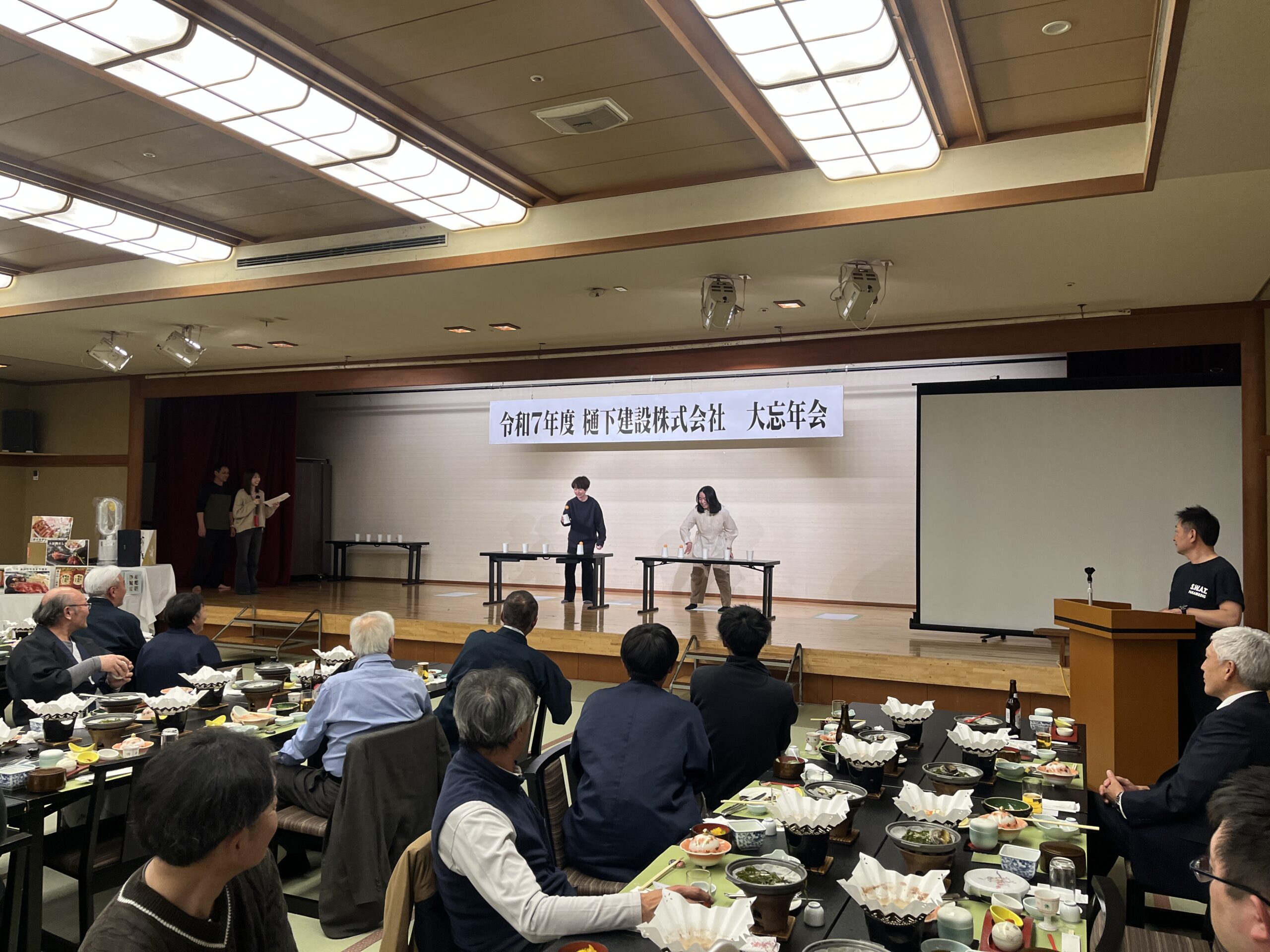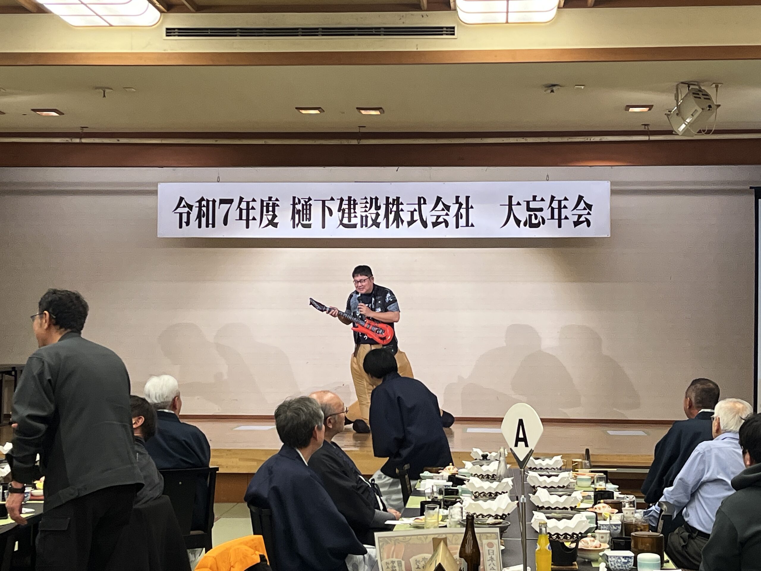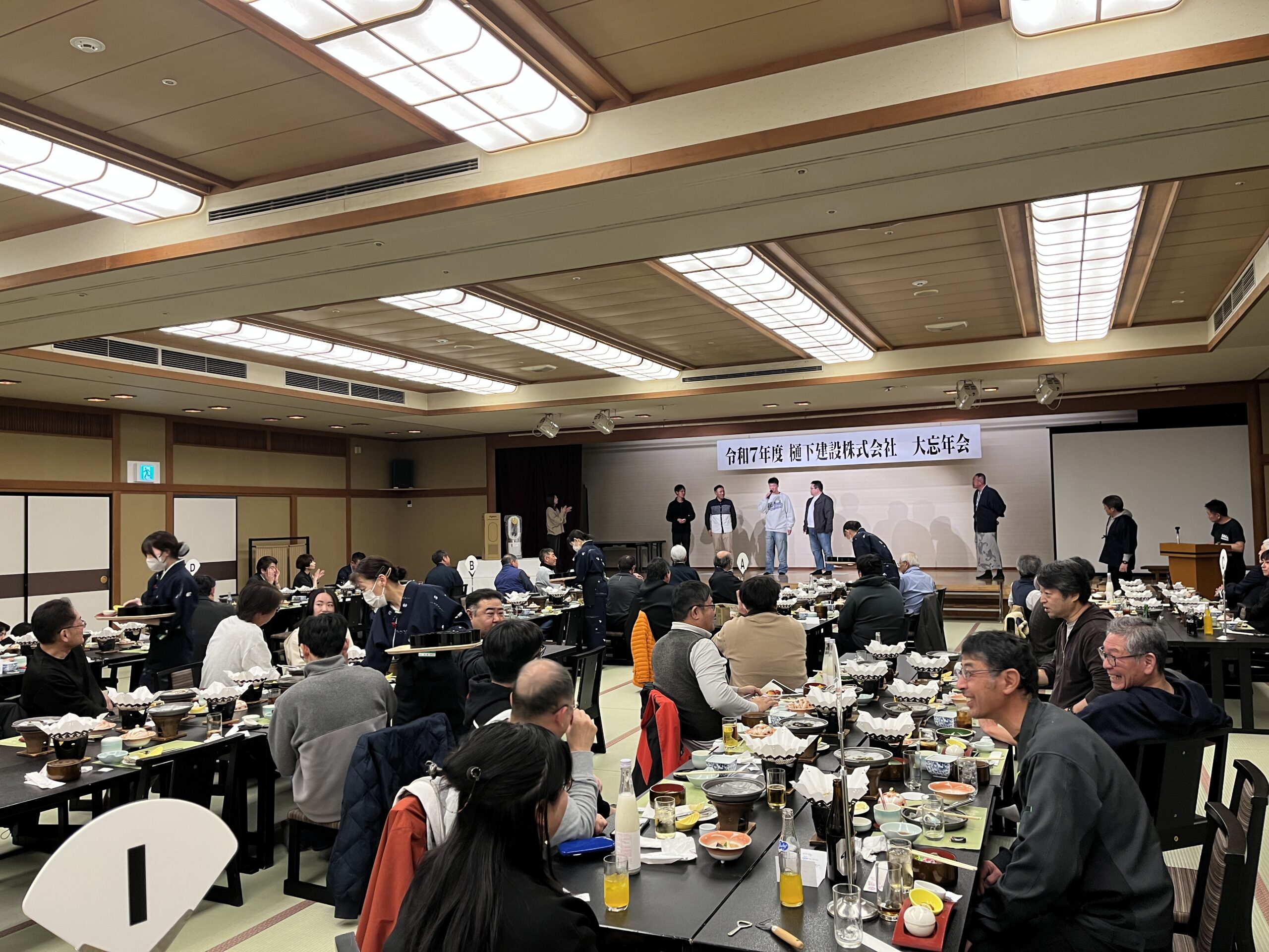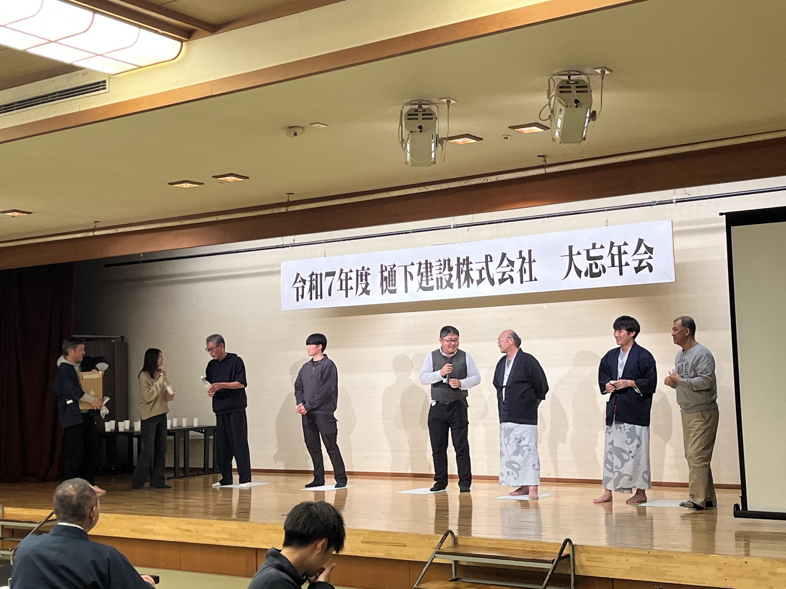 令和7年12月12日(金) つなぎ温泉ホテル紫苑にて、樋下建設(株)大忘年会を行いました。 美味しいお料理やお酒とともに、豪華賞品付きのゲームやじゃんけん大会で盛り上がりました。